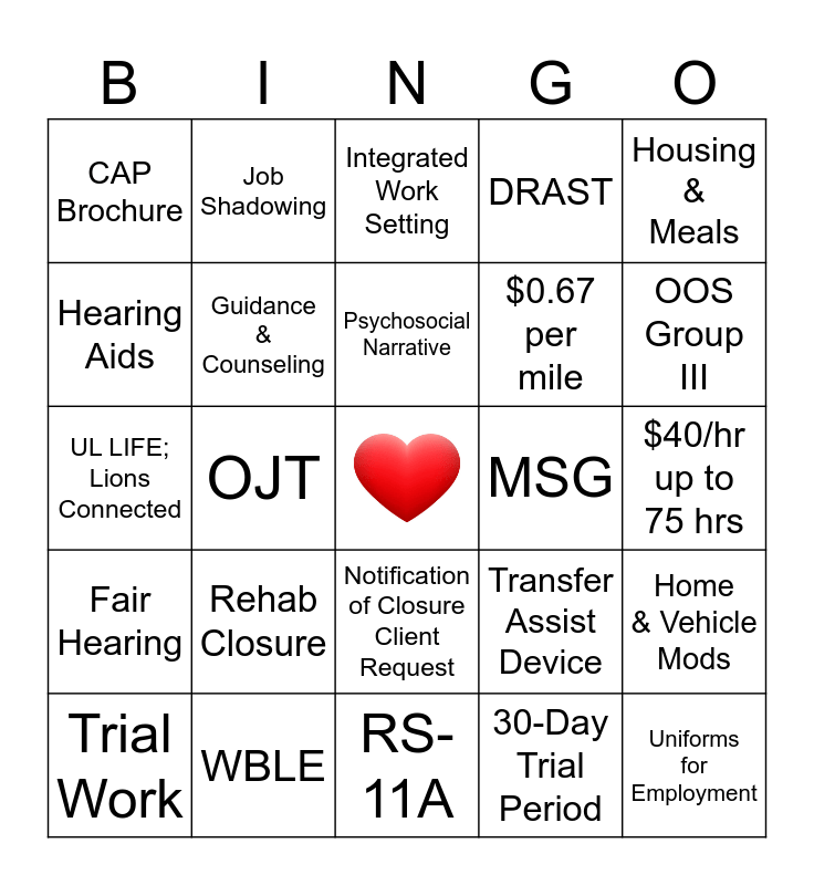 This bingo card has a free space and 24 words: Rehab Closure, WBLE, Psychosocial Narrative, Trial Work, Housing & Meals, CAP Brochure, Hearing Aids, Job Shadowing, MSG, Notification of Closure Client Request, $0.67 per mile, UL LIFE; Lions Connected, Transfer Assist Device, Home & Vehicle Mods, Guidance & Counseling, 30-Day Trial Period, $40/hr up to 75 hrs, Integrated Work Setting, OOS Group III, OJT, Uniforms for Employment, Fair Hearing, DRAST and RS-11A.