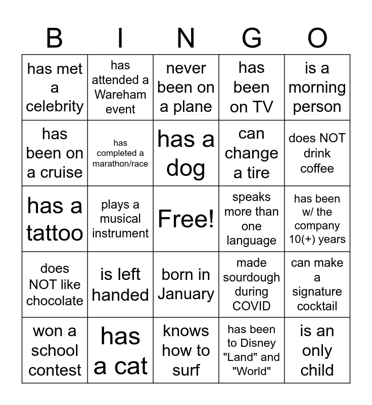 This bingo card has a free space and 24 words: is left handed, has a cat, has a dog, won a school contest, is a morning person, has met a celebrity, has been on a cruise, has attended a Wareham event, speaks more than one language, born in January, can change a tire, has a tattoo, made sourdough during COVID, can make a signature cocktail, has completed a marathon/race, has been to Disney "Land" and "World", has been w/ the company 10(+) years, never been on a plane, does NOT drink coffee, plays a musical instrument, is an only child, does NOT like chocolate, has been on TV and knows how to surf.