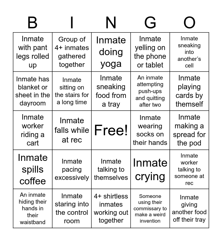 This bingo card has a free space and 24 words: Inmate pacing excessively, Inmate staring into the control room, Inmate sneaking food from a tray, An inmate hiding their hands in their waistband, Inmate sneaking into another’s cell, Inmate with pant legs rolled up, Inmate has blanket or sheet in the dayroom, Group of 4+ inmates gathered together, Inmate wearing socks on their hands, Inmate talking to themselves, An inmate attempting push-ups and quitting after two, Inmate worker riding a cart, Inmate crying, Inmate worker talking to someone at rec, Inmate sitting on the stairs for a long time, Someone using their commissary to make a weird invention, Inmate making a spread for the pod, Inmate doing yoga, Inmate playing cards by themself, Inmate falls while at rec, Inmate giving another food off their tray, Inmate spills coffee, Inmate yelling on the phone or tablet and 4+ shirtless inmates working out together.