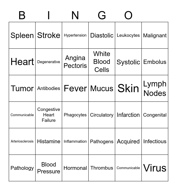 This bingo card has 36 words: Pathogens, Inflammation, Thrombus, Heart, Communicable, Mucus, Degenerative, Hormonal, Leukocytes, Acquired, Embolus, Diastolic, Infectious, Antibodies, White Blood Cells, Spleen, Arteriosclerosis, Skin, Tumor, Hypertension, Fever, Congestive Heart Failure, Circulatory, Phagocytes, Infarction, Stroke, Systolic, Blood Pressure, Angina Pectoris, Malignant, Virus, Pathology, Congenital, Lymph Nodes, Histamine and Communicable.