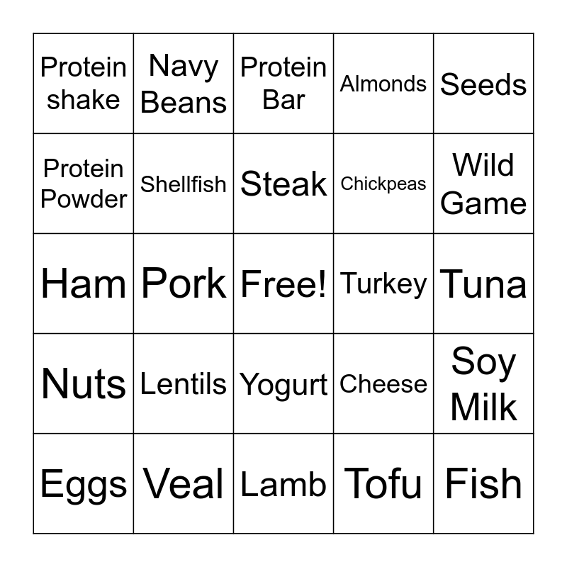 This bingo card has a free space and 29 words: Eggs, Chicken, Pork, Beef, Protein shake, Protein Bar, Shellfish, Lentils, Turkey, Veal, Tuna, Fish, Lamb, Tofu, Wild Game, Milk, Yogurt, Nuts, Seeds, Ham, Cheese, Beans, Chickpeas, Protein Powder, Almonds, Navy Beans, Soy Milk, Steak and Kidney Beans.