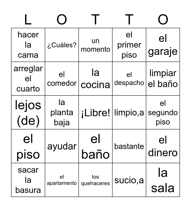 This bingo card has a free space and 40 words: cerca (de), lejos (de), vivir, el comedor, el apartamento, el baño, la cocina, el cuarto, el garaje, el piso, la planta baja, el primer piso, la sala, el segundo piso, limpio,a, ayudar, recibir, hacer la cama, dar de comer al perro, un momento, el dinero, sucio,a, el despacho, arreglar el cuarto, la escalera, el sótano, cocinar, cortar el césped, lavar la ropa, poner la mesa, quitar el polvo, sacar la basura, pasar la aspiradora, bastante, limpiar el baño, los quehaceres, si, ¿Qué estás haciendo?, ¿Cuáles? and lavar los platos.