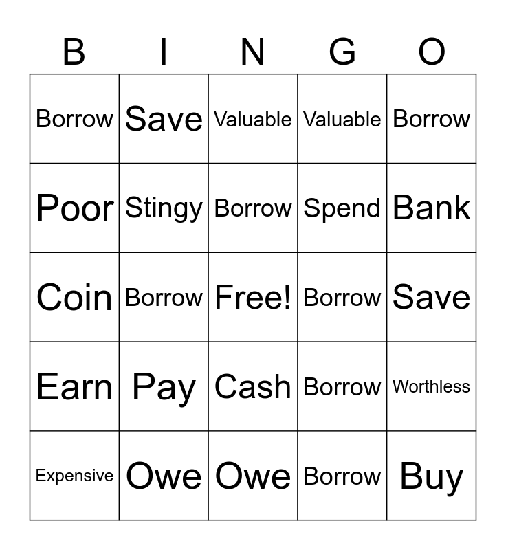 This bingo card has a free space and 48 words: Borrow, Buy, Lend, Owe, Pay, Raise, Save, Generous, Poor, Rich, Stingy, Valuable, Worthless, Borrow, Borrow, Borrow, Borrow, Borrow, Borrow, Borrow, Borrow, Borrow, Borrow, Spend, Waste, Bank, Expensive, Allowance, Cash, Earn, Dollar, Borrow, Buy, Lend, Owe, Pay, Raise, Save, Generous, Poor, Rich, Stingy, Valuable, Worthless, Coin, Bill, Trade and Gold.