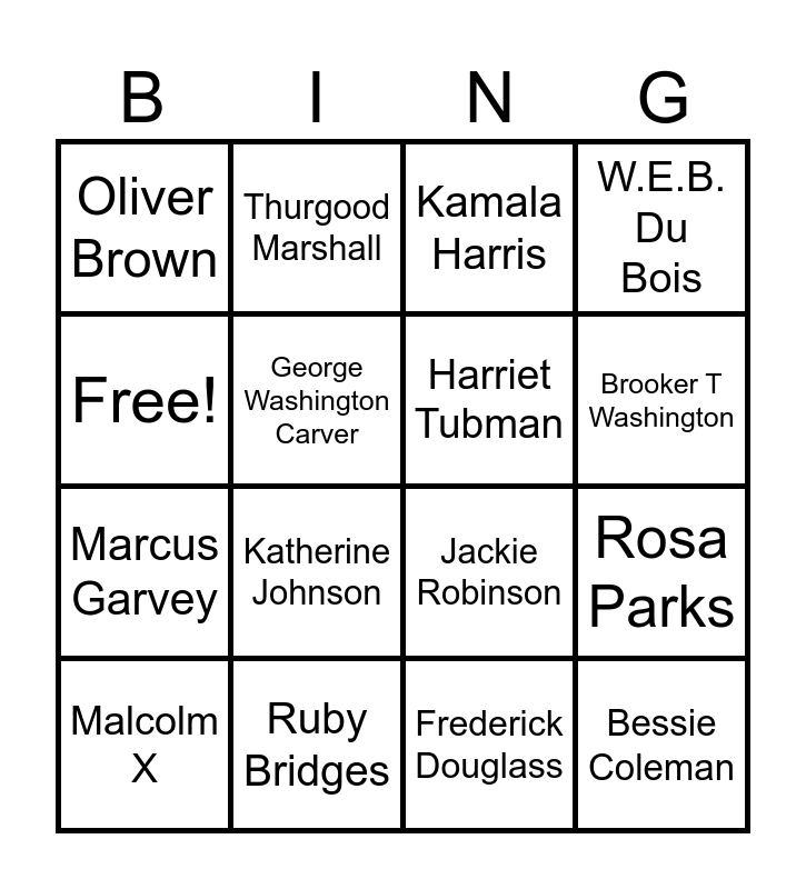 This bingo card has 16 words: Ruby Bridges, Rosa Parks, Kamala Harris, Oliver Brown, Marcus Garvey, Thurgood Marshall, Jackie Robinson, Frederick Douglass, Free!, George Washington Carver, Malcolm X, W.E.B. Du Bois, Katherine Johnson, Brooker T Washington, Harriet Tubman and Bessie Coleman.