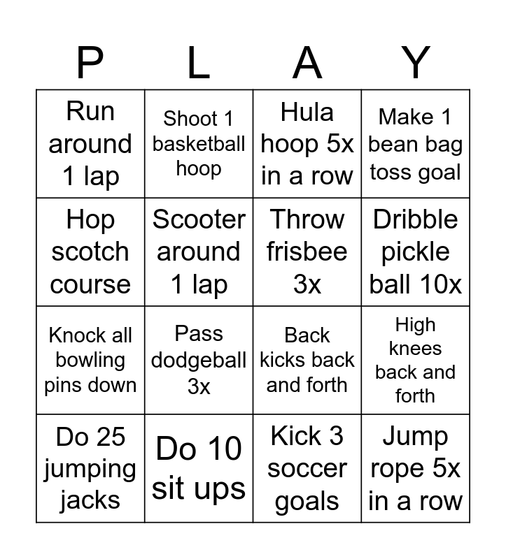 This bingo card has 16 words: Do 10 sit ups, High knees back and forth, Hula hoop 5x in a row, Run around 1 lap, Knock all bowling pins down, Shoot 1 basketball hoop, Back kicks back and forth, Kick 3 soccer goals, Hop scotch course, Scooter around 1 lap, Do 25 jumping jacks, Make 1 bean bag toss goal, Pass dodgeball 3x, Dribble pickle ball 10x, Throw frisbee 3x and Jump rope 5x in a row.