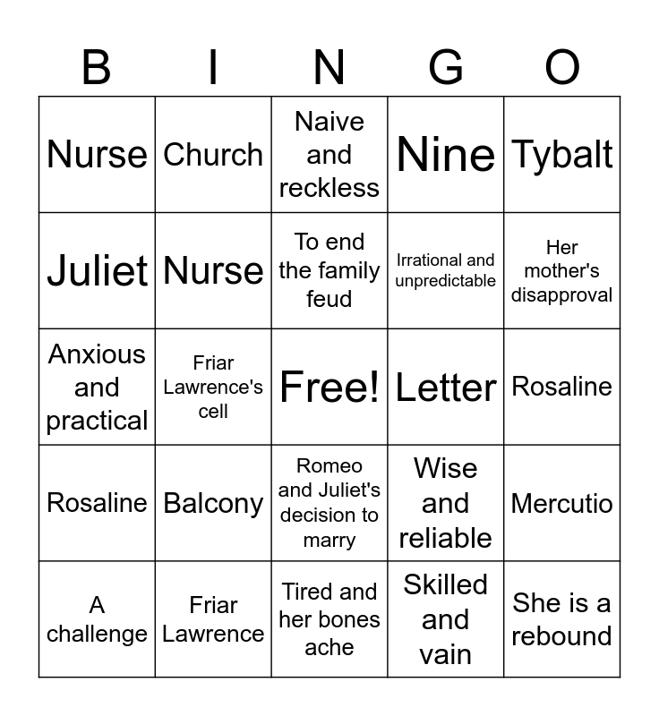 This bingo card has a free space and 24 words: Balcony, Friar Lawrence, To end the family feud, A challenge, Tybalt, Nurse, Juliet, Church, Letter, Romeo and Juliet's decision to marry, Irrational and unpredictable, Anxious and practical, Wise and reliable, Mercutio, Nurse, Skilled and vain, Rosaline, Naive and reckless, Her mother's disapproval, Friar Lawrence's cell, She is a rebound, Rosaline, Nine and Tired and her bones ache.