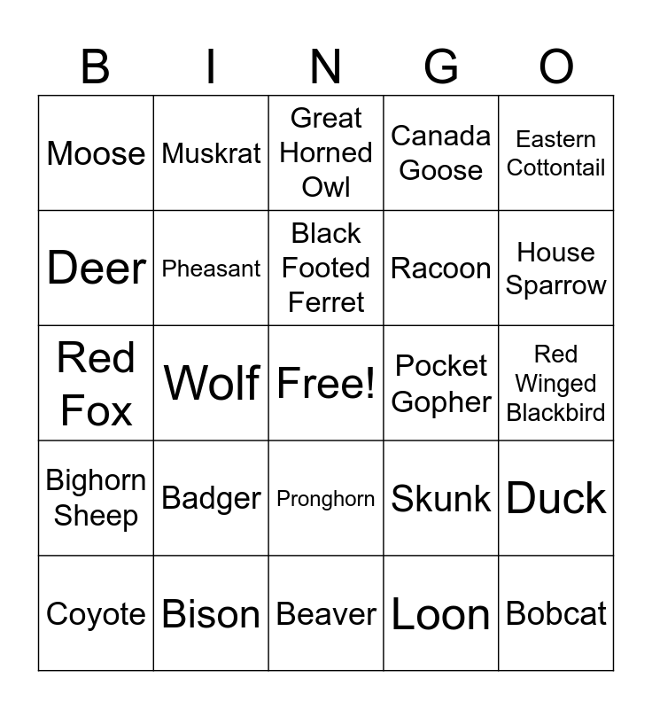 This bingo card has a free space and 25 words: Badger, Beaver, Black Footed Ferret, Coyote, Eastern Cottontail, Moose, Deer, Muskrat, Pocket Gopher, Pronghorn, Racoon, Red Fox, Skunk, Duck, Pheasant, Bald Eagle, Red Winged Blackbird, Great Horned Owl, House Sparrow, Wolf, Bobcat, Bison, Bighorn Sheep, Canada Goose and Loon.