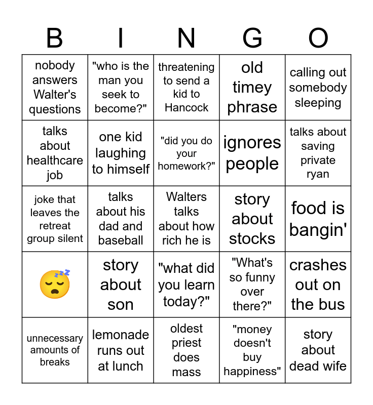 This bingo card has a free space and 24 words: story about son, lemonade runs out at lunch, "did you do your homework?", unnecessary amounts of breaks, calling out somebody sleeping, nobody answers Walter's questions, talks about healthcare job, "who is the man you seek to become?", story about stocks, "what did you learn today?", ignores people, joke that leaves the retreat group silent, "What's so funny over there?", crashes out on the bus, one kid laughing to himself, "money doesn't buy happiness", food is bangin', threatening to send a kid to Hancock, talks about saving private ryan, talks about his dad and baseball, story about dead wife, 😴, old timey phrase and oldest priest does mass.