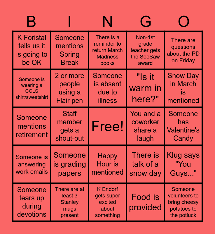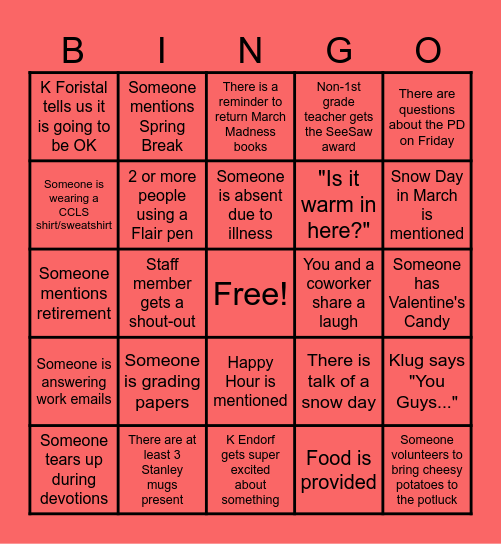 This bingo card has a free space and 32 words: Food is provided, Meeting starts late, Staff member gets a shout-out, Late arrival with a coffee in hand, Someone is answering work emails, 2 or more people using a Flair pen, There are questions about the PD on Friday, Klug says "You Guys...", Someone mentions Spring Break, Klug references Ted Neitzke, Someone is absent due to illness, There is a reminder to return March Madness books, Someone is wearing a vest, Maternity leave is discussed, You and a coworker share a laugh, A 1st grade teacher wins the SeeSaw award, Someone tears up during devotions, Someone mentions retirement, Happy Hour is mentioned, Someone is grading papers, There is talk of a snow day, STEAM night is mentioned, Someone has Valentine's Candy, There are at least 3 Stanley mugs present, Someone volunteers to bring cheesy potatoes to the potluck, Non-1st grade teacher gets the SeeSaw award, "Is it warm in here?", Someone is wearing a CCLS shirt/sweatshirt, K Foristal tells us it is going to be OK, K Endorf gets super excited about something, Someone gets called out for not paying attention and Snow Day in March is mentioned.