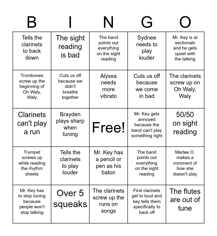 This bingo card has a free space and 24 words: Tells the clarinets to play louder, Over 5 squeaks, Alyssa needs more vibrato, Mr. Key has to stop tuning because people won't stop talking, Mr. Key is at sectionals and he gets upset with the talking, Tells the clarinets to back down, Trombones screw up the beginning of Oh Waly, Waly, The sight reading is bad, Mr. Key gets annoyed because the band can't play something right, Mr. Key has a pencil or pen as his baton, Cuts us off because we come in bad, Clarinets can't play a run, The band points out everything on the sight reading, Marlee O. makes a comment of how she doesn't play, Cuts us off because we didn't breathe together, First clarinets get to loud and key tells them specifically to back off, 50/50 on sight reading, The band points out everything on the sight reading, The clarinets screw up on Oh Waly, Waly, Brayden plays sharp when tuning, The flutes are out of tune, Trumpet screws up while reading the rhythm sheets, Sydnee needs to play louder and The clarinets screw up the runs on songs.