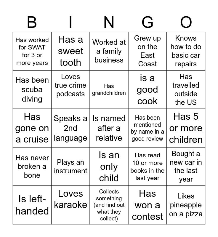 This bingo card has 30 words: Loves karaoke, Has a pet, Speaks a 2nd language, Has met a celebrity, Has worked for SWAT for 3 or more years, Worked at a family business, Loves true crime podcasts, Is an only child, Has been mentioned by name in a good review, Collects something (and find out what they collect), Has 5 or more children, Is named after a relative, Has won a contest, Likes pineapple on a pizza, Has travelled outside the US, Has been to Disney this year, Has read 10 or more books in the last year, Has never broken a bone, Plays an instrument, Knows how to do basic car repairs, Has gone on a cruise, Likes to garden, Has a sweet tooth, is a good cook, Has been scuba diving, Grew up on the East Coast, Bought a new car in the last year, Is left-handed, Has grandchildren and Has a vacation planned for this year.