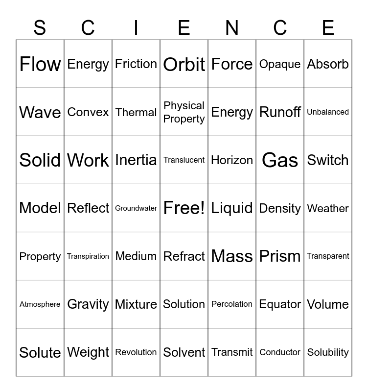 This bingo card has a free space and 48 words: Property, Reflect, Revolution, Refract, Energy, Density, Absorb, Solute, Work, Groundwater, Orbit, Force, Gas, Switch, Model, Gravity, Friction, Translucent, Percolation, Opaque, Unbalanced, Wave, Energy, Thermal, Transmit, Runoff, Weather, Atmosphere, Transpiration, Inertia, Solution, Horizon, Equator, Volume, Flow, Weight, Medium, Solvent, Liquid, Conductor, Transparent, Solid, Convex, Mixture, Physical Property, Mass, Prism and Solubility.