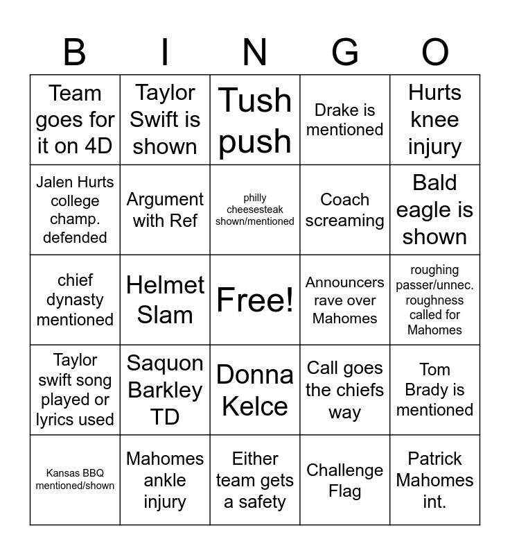 This bingo card has a free space and 24 words: Saquon Barkley TD, Mahomes ankle injury, philly cheesesteak shown/mentioned, Kansas BBQ mentioned/shown, Hurts knee injury, Team goes for it on 4D, Jalen Hurts college champ. defended, Taylor Swift is shown, Announcers rave over Mahomes, Donna Kelce, Coach screaming, chief dynasty mentioned, Call goes the chiefs way, Tom Brady is mentioned, Argument with Ref, Challenge Flag, roughing passer/unnec. roughness called for Mahomes, Tush push, Bald eagle is shown, Helmet Slam, Patrick Mahomes int., Taylor swift song played or lyrics used, Drake is mentioned and Either team gets a safety.