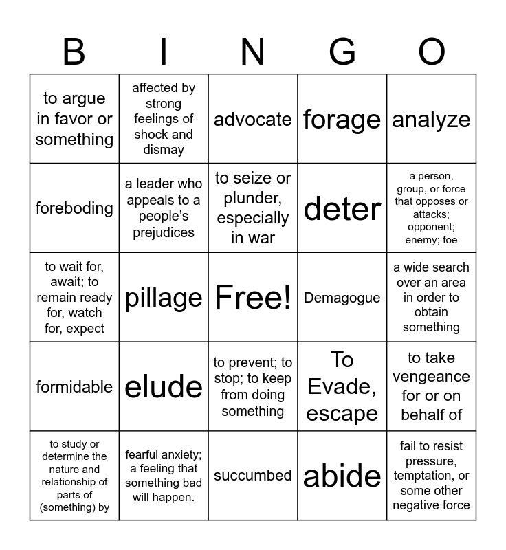 This bingo card has a free space and 24 words: elude, fearful anxiety; a feeling that something bad will happen., to seize or plunder, especially in war, to study or determine the nature and relationship of parts of (something) by, analyze, to argue in favor or something, foreboding, affected by strong feelings of shock and dismay, Demagogue, to prevent; to stop; to keep from doing something, deter, to wait for, await; to remain ready for, watch for, expect, To Evade, escape, to take vengeance for or on behalf of, a leader who appeals to a people’s prejudices, abide, a wide search over an area in order to obtain something, advocate, a person, group, or force that opposes or attacks; opponent; enemy; foe, pillage, fail to resist pressure, temptation, or some other negative force, formidable, forage and succumbed.