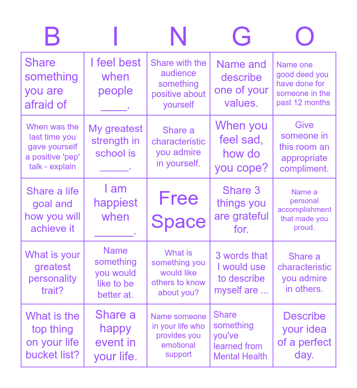 This bingo card has a free space and 29 words: What is the top thing on your life bucket list?, Name 2 things you are good at., I am happiest when ______., My favorite part of the day is ______., Share something you are afraid of, Share with the audience something positive about yourself, My greatest strength in school is _____., Name something you would like to be better at., Share 3 things you are grateful for., Share a happy event in your life., Name a personal accomplishment that made you proud., Describe your idea of a perfect day., Name someone in your life who provides you emotional support, Share something you've learned from Mental Health, Give someone in this room an appropriate compliment., Name one thing someone has done for you that made your happy., What is something you would like others to know about you?, What is your greatest personality trait?, Name one good deed you have done for someone in the past 12 months, Share a life goal and how you will achieve it, 3 words that I would use to describe myself are ..., What is the greatest improvement you have made this year?, When you feel sad, how do you cope?, When was the last time you gave yourself a positive 'pep' talk - explain, Name and describe one of your values., I feel best when people ____., Share a characteristic you admire in others., Share a characteristic you admire in yourself. and Give the person across from you a compliment..