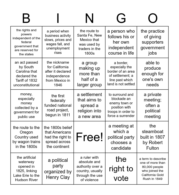 This bingo card has 26 words: Free!, the right to vote, a group making up more than half of a larger group, a political party organized by Henry Clay, the practice of giving supporters government jobs, the rights and powers independent of the federal government that are reserved for the states, an act passed by South Carolina that declared the Tariff of 1832 unconstitutional, a period when business activity slows, prices and wages fall, and unemployment rises, a private meeting; often a political meeting, a meeting at which a political party chooses a candidate, a border, especially the border of an area of settlement; a line past which land is not settled, money, especially money collected by a government for public use, the steamboat built in 1807 by Robert Fulton, the artificial waterway opened in 1825, linking Lake Erie to the Hudson River, the first federally funded national road project, begun in 1811, a trapper who explored and hunted in the American West in the early 1800s, a person who follows his or her own independent course in life, the route to the Oregon Country used by wagon trains in the 1800s, the route to Santa Fe, New Mexico that was used by traders in the 1800s, a settlement that aims to spread a religion into a new area, able to produce enough for one's own needs, a ruler with absolute and authority over a country, usually through the use of violence, to surround and blockade an enemy town or position with troops in order to force a surrender, the 1800s belief that Americans had the right to spread across the continent, the nickname for California after it declared independence from Mexico in 1846 and a term to describe one of more than 80,000 people who joined the California Gold Rush in 1849.