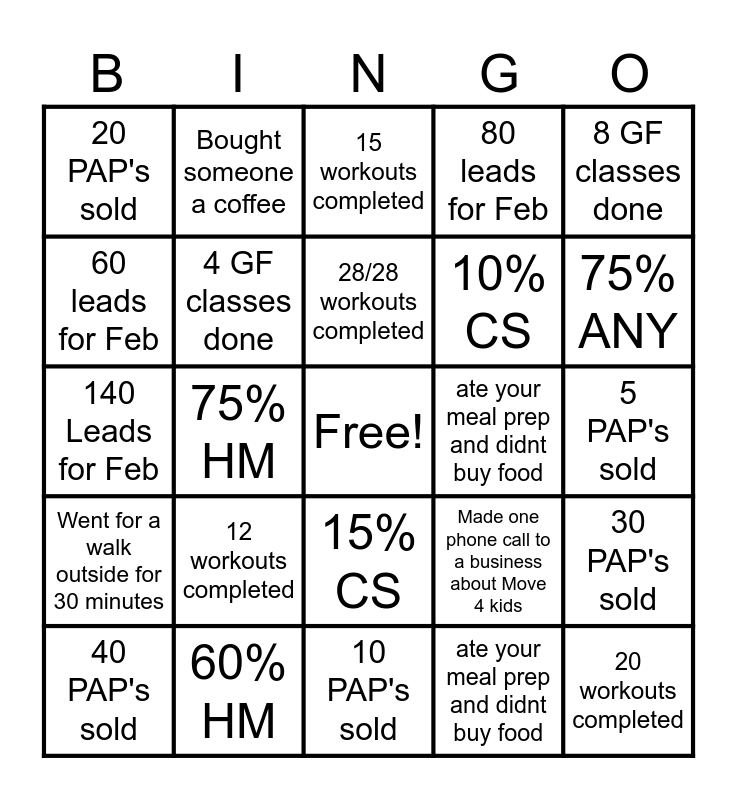 This bingo card has a free space and 24 words: 12 workouts completed, 60% HM, 28/28 workouts completed, 40 PAP's sold, 8 GF classes done, 20 PAP's sold, 60 leads for Feb, Bought someone a coffee, ate your meal prep and didnt buy food, 15% CS, 10% CS, 140 Leads for Feb, Made one phone call to a business about Move 4 kids, 30 PAP's sold, 4 GF classes done, ate your meal prep and didnt buy food, 5 PAP's sold, 15 workouts completed, 75% ANY, 75% HM, 20 workouts completed, Went for a walk outside for 30 minutes, 80 leads for Feb and 10 PAP's sold.