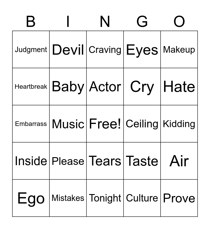 This bingo card has a free space and 24 words: Please, Mistakes, Actor, Ego, Makeup, Judgment, Heartbreak, Devil, Ceiling, Tears, Cry, Embarrass, Taste, Air, Baby, Culture, Kidding, Craving, Hate, Music, Prove, Inside, Eyes and Tonight.