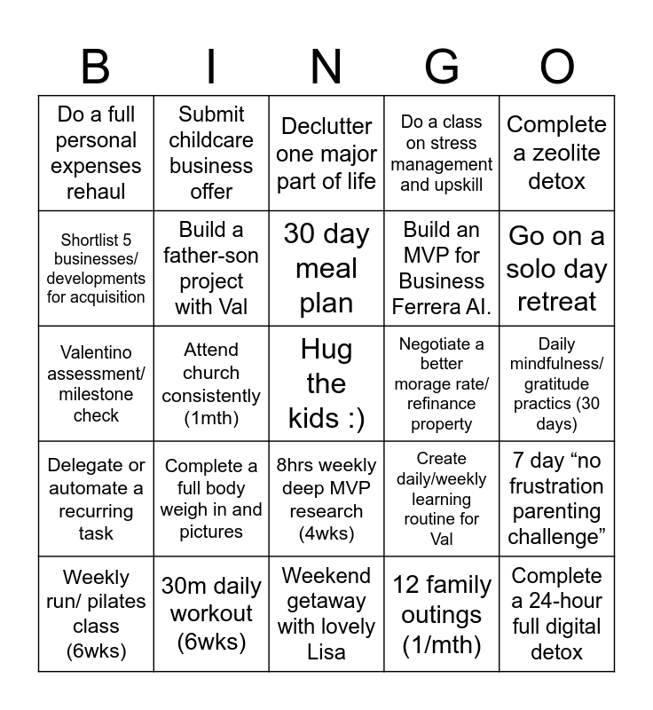 This bingo card has a free space and 24 words: Complete a full body weigh in and pictures, 30m daily workout (6wks), 30 day meal plan, Weekly run/ pilates class (6wks), Complete a zeolite detox, Do a full personal expenses rehaul, Shortlist 5 businesses/ developments for acquisition, Submit childcare business offer, Negotiate a better morage rate/ refinance property, 8hrs weekly deep MVP research (4wks), Build an MVP for Business Ferrera AI., Valentino assessment/ milestone check, Create daily/weekly learning routine for Val, 7 day “no frustration parenting challenge”, Build a father-son project with Val, 12 family outings (1/mth), Daily mindfulness/ gratitude practics (30 days), Declutter one major part of life, Go on a solo day retreat, Attend church consistently (1mth), Complete a 24-hour full digital detox, Delegate or automate a recurring task, Do a class on stress management and upskill and Weekend getaway with lovely Lisa.