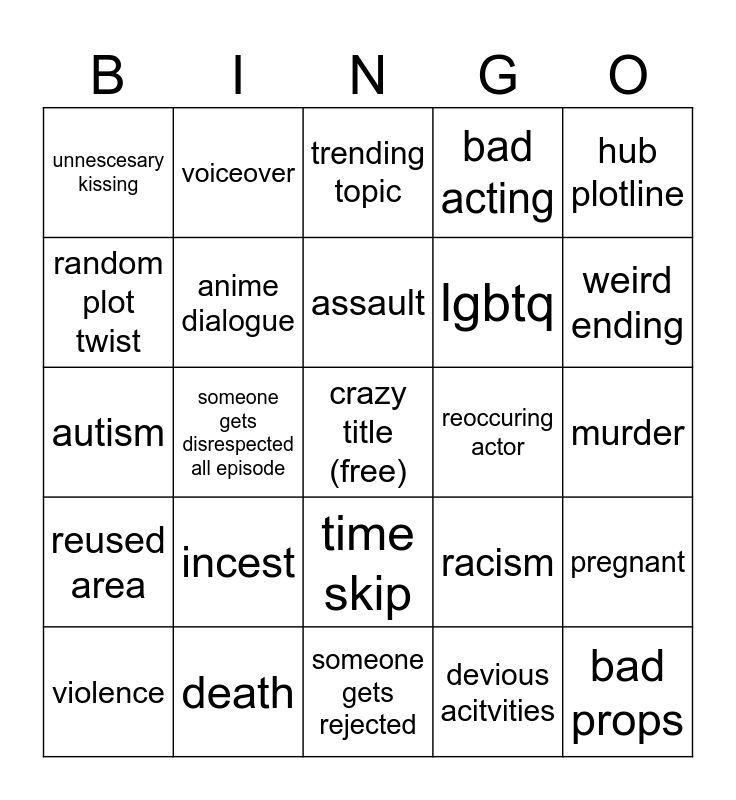 This bingo card has a free space and 24 words: incest, death, assault, violence, hub plotline, unnescesary kissing, random plot twist, voiceover, reoccuring actor, time skip, lgbtq, autism, racism, pregnant, anime dialogue, devious acitvities, murder, trending topic, weird ending, someone gets disrespected all episode, bad props, reused area, bad acting and someone gets rejected.