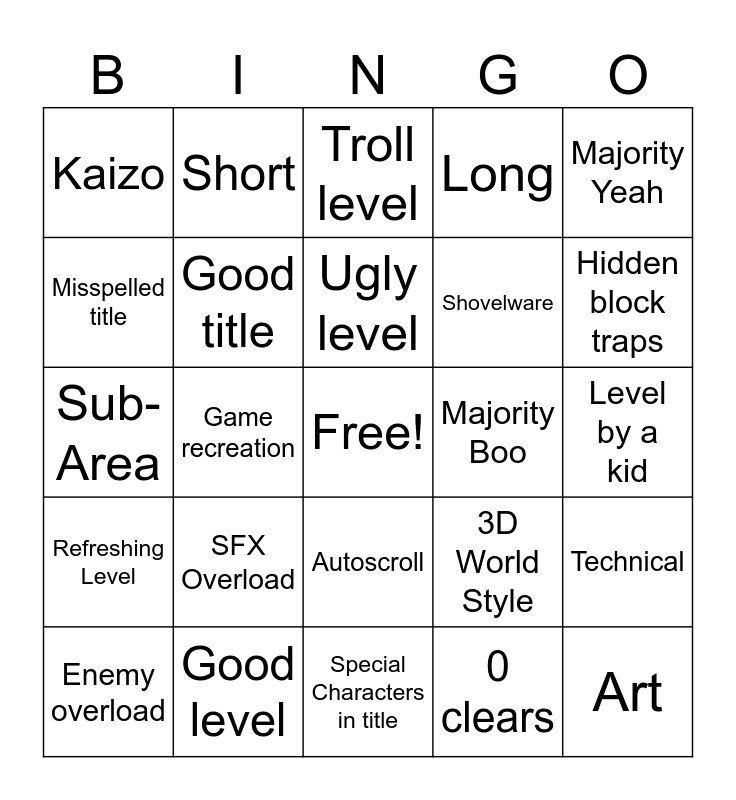 This bingo card has a free space and 24 words: SFX Overload, Good level, Ugly level, Enemy overload, Majority Yeah, Kaizo, Misspelled title, Short, Majority Boo, Autoscroll, Shovelware, Sub-Area, 3D World Style, Technical, Good title, 0 clears, Level by a kid, Troll level, Hidden block traps, Game recreation, Art, Refreshing Level, Long and Special Characters in title.
