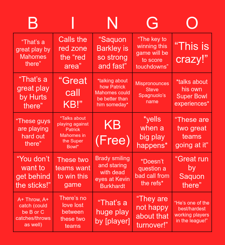 This bingo card has a free space and 24 words: These two teams want to win this game, There’s no love lost between these two teams, *talking about how Patrick Mahomes could be better than him someday*, A+ Throw, A+ catch (could be B or C catches/throws as well), “This is crazy!”, “That’s a great play by Mahomes there”, “That’s a great play by Hurts there”, Calls the red zone the “red area”, *yells when a big play happens*, Brady smiling and staring with dead eyes at Kevin Burkhardt, Mispronounces Steve Spagnuolo’s name, “These guys are playing hard out there”, *Doesn’t question a bad call from the refs*, “Great run by Saquon there”, “Great call KB!”, “They are not happy about that turnover!”, “These are two great teams going at it”, “Saquon Barkley is so strong and fast”, *talks about his own Super Bowl experiences*, *Talks about playing against Patrick Mahomes in the Super Bowl*, “He’s one of the best/hardest working players in the league!”, “You don’t want to get behind the sticks!”, “The key to winning this game will be to score touchdowns” and “That’s a huge play by [player].