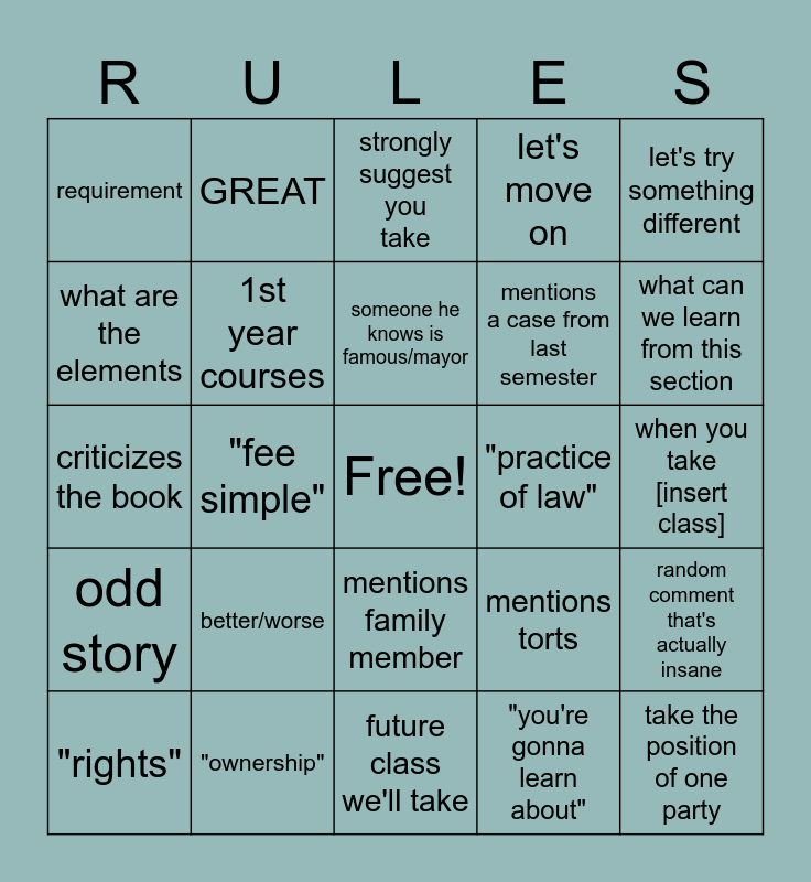 This bingo card has a free space and 29 words: "rights", something about the old book, "fee simple", so we said..., requirement, strongly suggest you take, 1st year courses, better/worse, "practice of law", "ownership", when you take [insert class], take the position of one party, future class we'll take, "you're gonna learn about", what can we learn from this section, page #, mentions family member, odd story, let's try something different, criticizes the book, mentions torts, mentions contracts, mentions a case from last semester, what are the elements, let's move on, GREAT, random comment that's actually insane, someone he knows is famous/mayor and that's what you'll do.