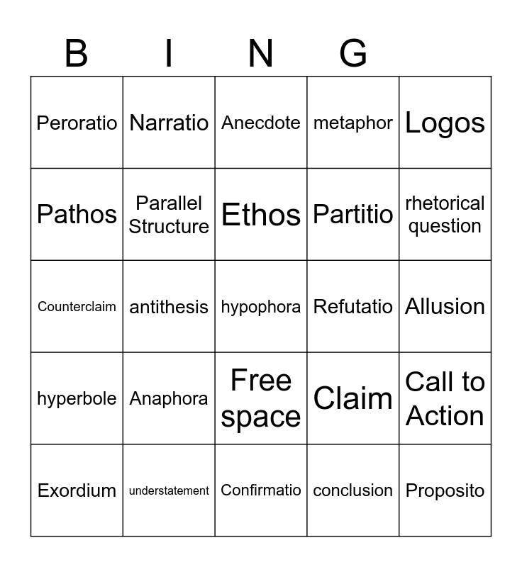 This bingo card has 25 words: Anaphora, Confirmatio, Ethos, Exordium, Logos, Peroratio, Pathos, Narratio, Refutatio, Free space, Partitio, Counterclaim, Claim, Call to Action, Parallel Structure, Proposito, Allusion, Anecdote, rhetorical question, antithesis, hypophora, understatement, hyperbole, metaphor and conclusion.