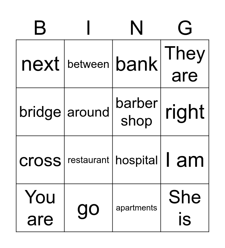 This bingo card has 25 words: Free!, left, right, street, bridge, next, around, between, go, turn, cross, hospital, school, pharmacy, barber shop, supermarket, apartments, bank, restaurant, I am, You are, He is, She is, They are and We are.