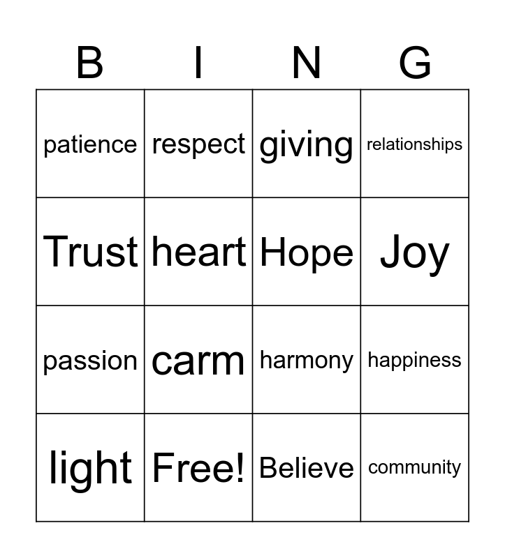 This bingo card has 28 words: peace, love, passion, unity, heart, giving, respect, community, Free!, power, harmony, relationships, Beautiful, God, carm, kind, Faith, Hope, Joy, strenght, patience, Grace, light, happiness, Believe, Family, Trust and Friends.