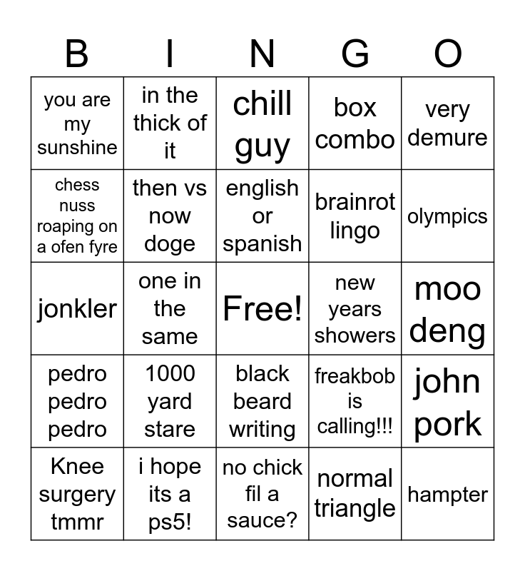 This bingo card has a free space and 29 words: Knee surgery tmmr, i just want to be part of your symphony, one in the same, 5 big booms \ Costco guys, you are my sunshine, chill guy, then vs now doge, 1000 yard stare, new years showers, i hope its a ps5!, moo deng, hampter, no chick fil a sauce?, normal triangle, olympics, IVE PLAYED THESE GAMES BEFORE, black beard writing, pedro pedro pedro, very demure, jonkler, freakbob is calling!!!, the rizzler, brainrot lingo, chess nuss roaping on a ofen fyre, box combo, in the thick of it, john pork, english or spanish and low taper fade.