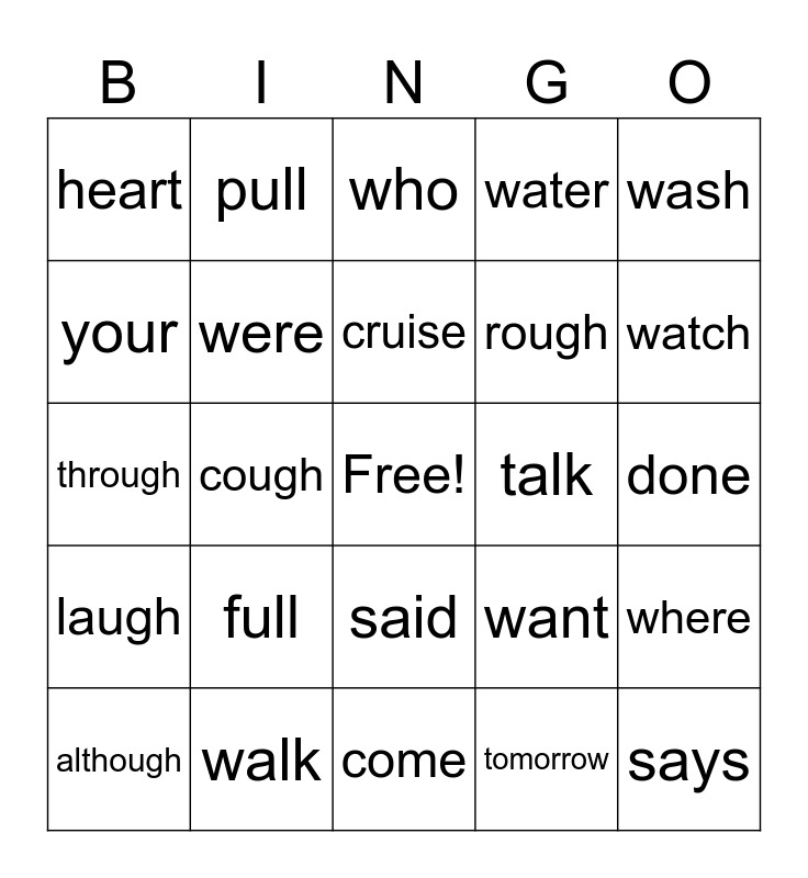 This bingo card has a free space and 24 words: full, walk, cruise, although, wash, heart, your, pull, talk, said, rough, through, want, where, were, tomorrow, done, who, watch, cough, says, laugh, water and come.