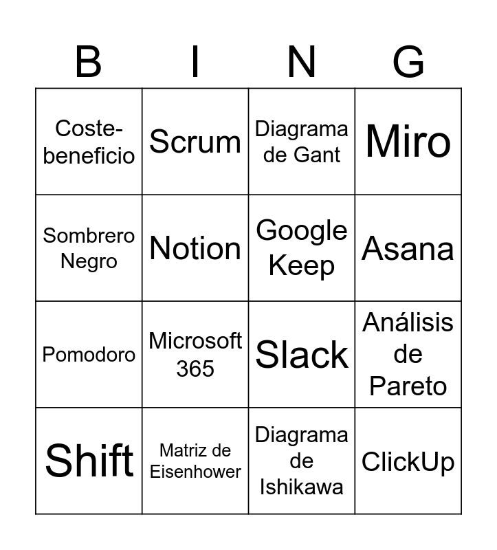 This bingo card has 16 words: Matriz de Eisenhower, Análisis de Pareto, Diagrama de Gant, Coste- beneficio, Pomodoro, Scrum, Slack, Diagrama de Ishikawa, Sombrero Negro, Notion, Shift, Miro, Microsoft 365, Asana, Google Keep and ClickUp.