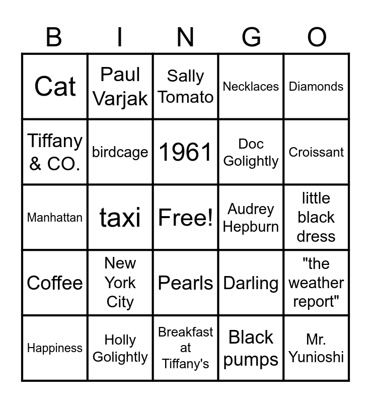 This bingo card has a free space and 24 words: New York City, Holly Golightly, 1961, Happiness, Diamonds, Cat, Tiffany & CO., Paul Varjak, Audrey Hepburn, Pearls, Doc Golightly, Manhattan, Darling, "the weather report", birdcage, Black pumps, little black dress, Sally Tomato, Croissant, taxi, Mr. Yunioshi, Coffee, Necklaces and Breakfast at Tiffany's.