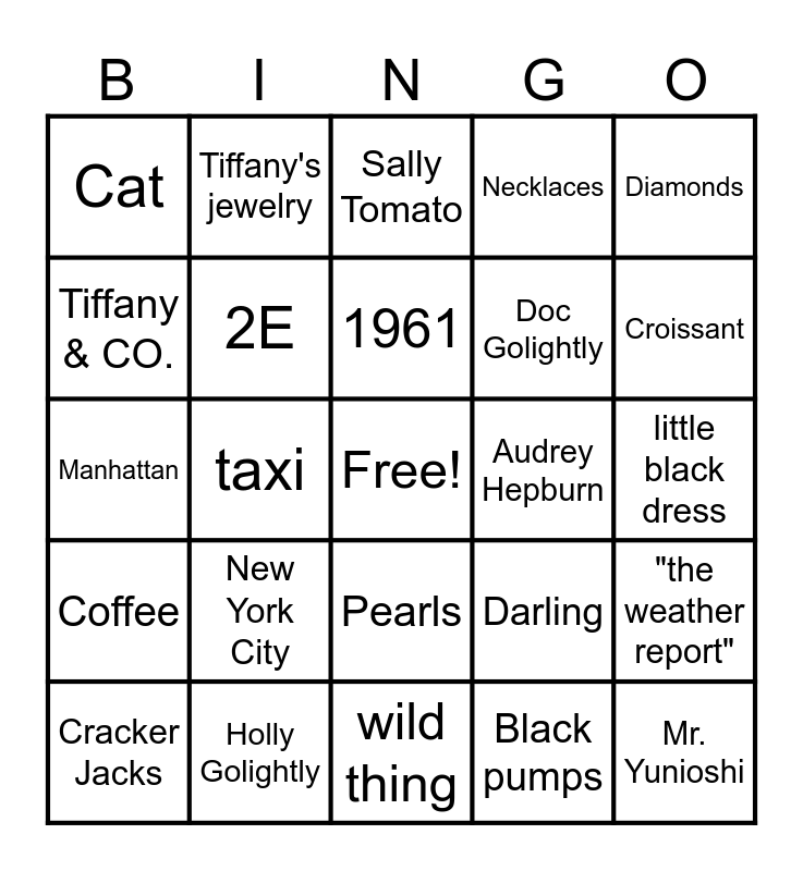 This bingo card has a free space and 24 words: New York City, Holly Golightly, 1961, Cracker Jacks, Diamonds, Cat, Tiffany & CO., Tiffany's jewelry, Audrey Hepburn, Pearls, Doc Golightly, Manhattan, Darling, "the weather report", 2E, Black pumps, little black dress, Sally Tomato, Croissant, taxi, Mr. Yunioshi, Coffee, Necklaces and wild thing.