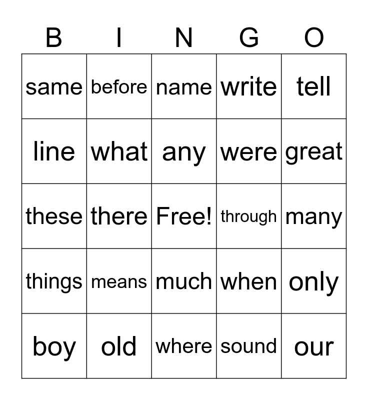 This bingo card has a free space and 24 words: means, old, any, boy, tell, same, line, before, through, much, were, these, when, only, what, sound, many, name, great, there, our, things, write and where.
