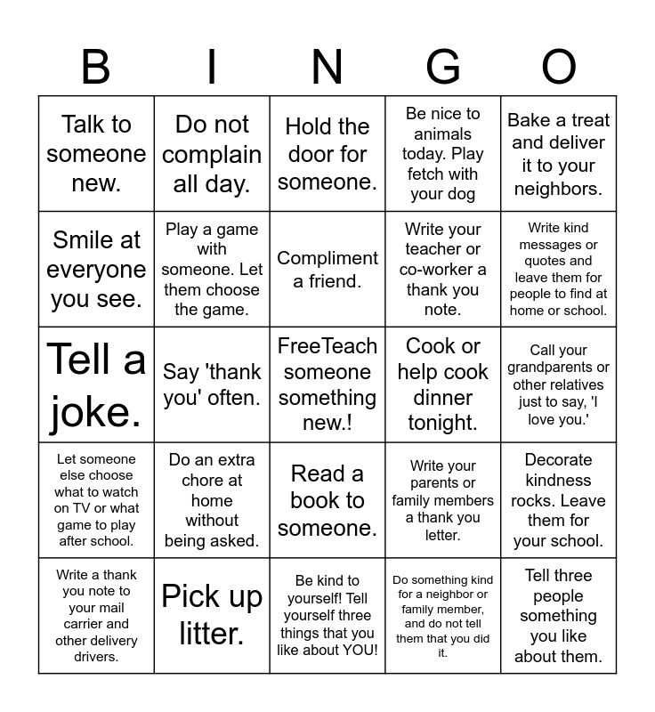 This bingo card has a free space and 24 words: Do an extra chore at home without being asked., Pick up litter., Compliment a friend., Write a thank you note to your mail carrier and other delivery drivers., Bake a treat and deliver it to your neighbors., Talk to someone new., Smile at everyone you see., Do not complain all day., Cook or help cook dinner tonight., Read a book to someone., Write your teacher or co-worker a thank you note., Tell a joke., Write your parents or family members a thank you letter., Decorate kindness rocks. Leave them for your school., Play a game with someone. Let them choose the game., Do something kind for a neighbor or family member, and do not tell them that you did it., Call your grandparents or other relatives just to say, 'I love you.', Hold the door for someone., Write kind messages or quotes and leave them for people to find at home or school., Say 'thank you' often., Tell three people something you like about them., Let someone else choose what to watch on TV or what game to play after school., Be nice to animals today. Play fetch with your dog and Be kind to yourself! Tell yourself three things that you like about YOU!.