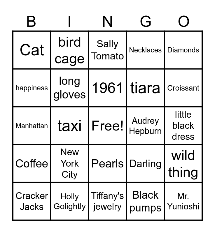 This bingo card has a free space and 24 words: New York City, Holly Golightly, 1961, Cracker Jacks, Diamonds, Cat, happiness, bird cage, Audrey Hepburn, Pearls, tiara, Manhattan, Darling, wild thing, long gloves, Black pumps, little black dress, Sally Tomato, Croissant, taxi, Mr. Yunioshi, Coffee, Necklaces and Tiffany's jewelry.