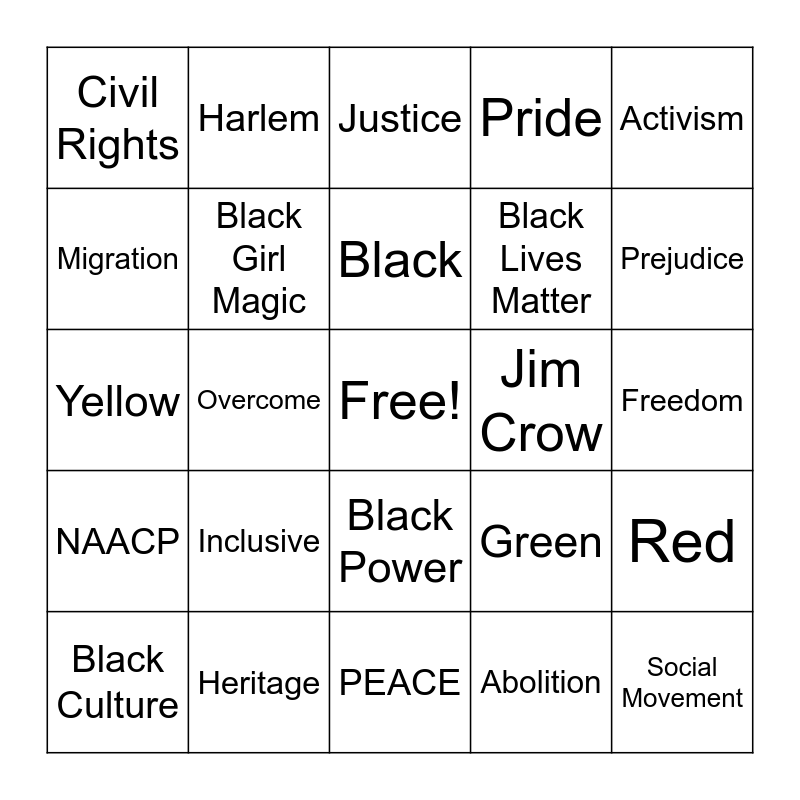 This bingo card has a free space and 24 words: Inclusive, Heritage, Black, Black Culture, Activism, Civil Rights, Migration, Harlem, Jim Crow, Black Power, Black Lives Matter, Yellow, Green, Red, Black Girl Magic, Abolition, Freedom, Justice, Prejudice, Overcome, Social Movement, NAACP, Pride and PEACE.