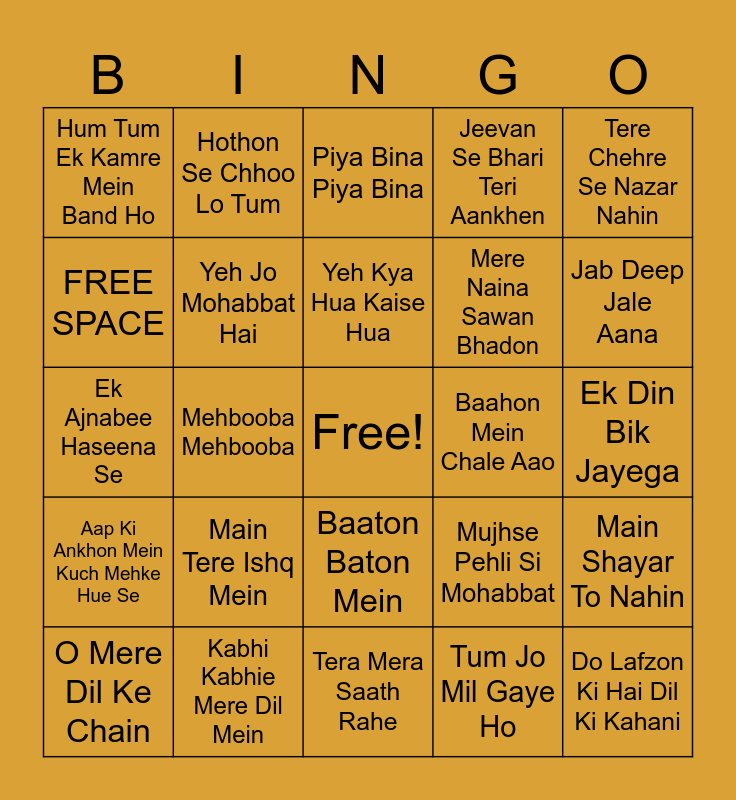 This bingo card has a free space and 60 words: Chura Liya Hai Tumne Jo Dil Ko, Kabhi Kabhie Mere Dil Mein, Ek Pyar Ka Nagma Hai, Aap Ki Ankhon Mein Kuch Mehke Hue Se, Tum Jo Mil Gaye Ho, Kora Kagaz Tha Yeh Man Mera, Yeh Jo Mohabbat Hai, Maine Tere Liye Hi Saat Rang Ke Sapne, Mere Naina Sawan Bhadon, Tera Mujhse Hai Pehle Ka Naata Koi, Jeevan Se Bhari Teri Aankhen, Chalte Chalte Yun Hi Koi Mil Gaya, FREE SPACE, Roop Tera Mastana, Dil Kya Kare Jab Kisi Se, Hum Tum Ek Kamre Mein Band Ho, Do Lafzon Ki Hai Dil Ki Kahani, Tere Chehre Se Nazar Nahin, Rimjhim Gire Saawan, Yeh Kya Hua Kaise Hua, Baahon Mein Chale Aao, Piya Bina Piya Bina, O Mere Dil Ke Chain, Main Shayar To Nahin, Bheegi Bheegi Raaton Mein, Mujhe Teri Mohabbat Ka Sahara, Tum Bin Jaun Kahan, Yeh Shaam Mastani, Jab Deep Jale Aana, Tere Mere Milan Ki Yeh Raina, O Saathi Re Tere Bina Bhi Kya Jeena, Samne Yeh Kaun Aaya, Kya Hua Tera Wada, Wada Karo Nahin Chhodoge, Hothon Se Chhoo Lo Tum, Aaj Mausam Bada Beimaan Hai, Mere Dil Mein Aaj Kya Hai, Mehbooba Mehbooba, Aa Jane Jaan, Ek Ajnabee Haseena Se, Bahon Mein Chale Aao, Main Tere Ishq Mein, Ek Din Bik Jayega, Khaike Paan Banaras Wala, Mujhse Pehli Si Mohabbat, Raat Kali Ek Khwab Mein Aayi, Dil Deta Hai Ro Ro Duhai, Ab Ke Sawan Aise Barse, Tumhe Dekhti Hoon, Baaton Baton Mein, Tera Mera Saath Rahe, Pyar Diwana Hota Hai, Tum Pukar Lo, Tumse Milke Aisa Laga, Yeh Raaten Yeh Mausam, Mere Sapno Ki Rani Kab Aayegi Tu, Phoolon Ka Taron Ka, Yeh Chand Sa Roshan Chehra, Chand Mera Dil Chandni Ho Tum and Dil Se Teri Nigah.