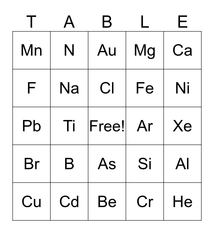 This bingo card has a free space and 48 words: H, He, Li, Be, B, C, N, O, F, Ne, Na, Mg, Al, Si, P, S, Cl, Ar, K, Ca, Ti, Cr, Mn, Fe, Co, Ni, Cu, Zn, As, Br, Kr, Rb, Sr, Ag, Cd, Sn, I, Xe, Cs, Ba, W, Pt, Au, Hg, Pb, Rn, U and Pu.