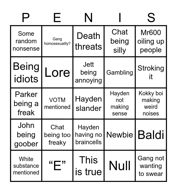 This bingo card has a free space and 24 words: White substance mentioned, Chat being too freaky, Jett being annoying, Null, Mr600 oiling up people, Some random nonsense, Gang homosexuality?, Death threats, Hayden not making sense, Kokky boi making weird noises, Parker being a freak, Lore, Newbie, Baldi, Being idiots, āEā, This is true, Chat being silly, Stroking it, John being goober, VOTM mentioned, Hayden having no braincells, Gambling and Gang not wanting to swear.