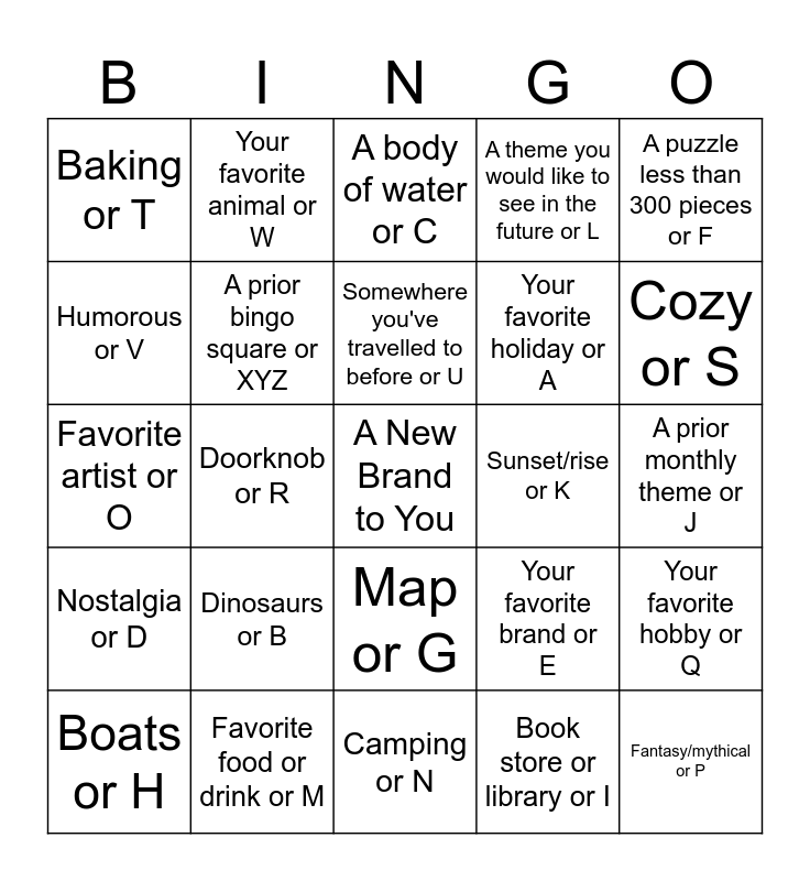 This bingo card has a free space and 24 words: Dinosaurs or B, Favorite food or drink or M, Somewhere you've travelled to before or U, Boats or H, A puzzle less than 300 pieces or F, Baking or T, Humorous or V, Your favorite animal or W, Sunset/rise or K, Map or G, Your favorite holiday or A, Favorite artist or O, Your favorite brand or E, Your favorite hobby or Q, A prior bingo square or XYZ, Book store or library or I, A prior monthly theme or J, A body of water or C, Cozy or S, Doorknob or R, Fantasy/mythical or P, Nostalgia or D, A theme you would like to see in the future or L and Camping or N.
