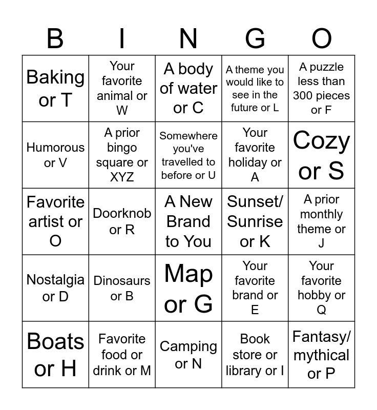 This bingo card has a free space and 24 words: Dinosaurs or B, Favorite food or drink or M, Somewhere you've travelled to before or U, Boats or H, A puzzle less than 300 pieces or F, Baking or T, Humorous or V, Your favorite animal or W, Sunset/ Sunrise or K, Map or G, Your favorite holiday or A, Favorite artist or O, Your favorite brand or E, Your favorite hobby or Q, A prior bingo square or XYZ, Book store or library or I, A prior monthly theme or J, A body of water or C, Cozy or S, Doorknob or R, Fantasy/ mythical or P, Nostalgia or D, A theme you would like to see in the future or L and Camping or N.