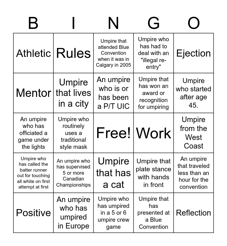 This bingo card has a free space and 24 words: An umpire who has supervised 5 or more Canadian Championships, An umpire who has umpired in Europe, An umpire who is or has been a P/T UIC, Positive, Ejection, Athletic, Mentor, Rules, Work, Umpire that has a cat, Umpire that has won an award or recognition for umpiring, An umpire who has officiated a game under the lights, Umpire that plate stance with hands in front, An umpire that traveled less than an hour for the convention, Umpire that lives in a city, Umpire that has presented at a Blue Convention, Umpire from the West Coast, Umpire that attended Blue Convention when it was in Calgary in 2005, Umpire who started after age 45., Umpire who routinely uses a traditional style mask, Reflection, Umpire who has called the batter runner out for touching all white on first attempt at first, Umpire who has had to deal with an "illegal re-entry" and Umpire who has umpired in a 5 or 6 umpire crew game.