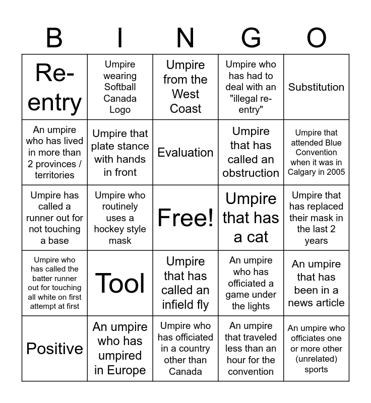 This bingo card has a free space and 24 words: Tool, An umpire who has umpired in Europe, Evaluation, Positive, Substitution, Re-entry, An umpire who has lived in more than 2 provinces / territories, Umpire wearing Softball Canada Logo, Umpire that has a cat, Umpire that has called an infield fly, Umpire that has called an obstruction, Umpire has called a runner out for not touching a base, An umpire who has officiated a game under the lights, An umpire that has been in a news article, Umpire that plate stance with hands in front, An umpire that traveled less than an hour for the convention, Umpire that has replaced their mask in the last 2 years, Umpire from the West Coast, Umpire that attended Blue Convention when it was in Calgary in 2005, Umpire who routinely uses a hockey style mask, An umpire who officiates one or more other (unrelated) sports, Umpire who has called the batter runner out for touching all white on first attempt at first, Umpire who has had to deal with an "illegal re-entry" and Umpire who has officiated in a country other than Canada.