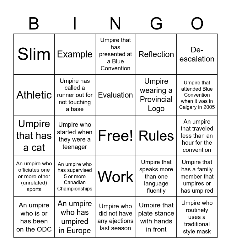 This bingo card has a free space and 24 words: An umpire who has supervised 5 or more Canadian Championships, An umpire who has umpired in Europe, Evaluation, An umpire who is or has been on the ODC, De-escalation, Slim, Athletic, Example, Rules, Work, Umpire wearing a Provincial Logo, Umpire that has a cat, Umpire that speaks more than one language fluently, Umpire that has a family member that umpires or has umpired, Umpire has called a runner out for not touching a base, Umpire that plate stance with hands in front, An umpire that traveled less than an hour for the convention, Umpire that has presented at a Blue Convention, Umpire that attended Blue Convention when it was in Calgary in 2005, Umpire who started when they were a teenager, Umpire who routinely uses a traditional style mask, An umpire who officiates one or more other (unrelated) sports, Reflection and Umpire who did not have any ejections last season.