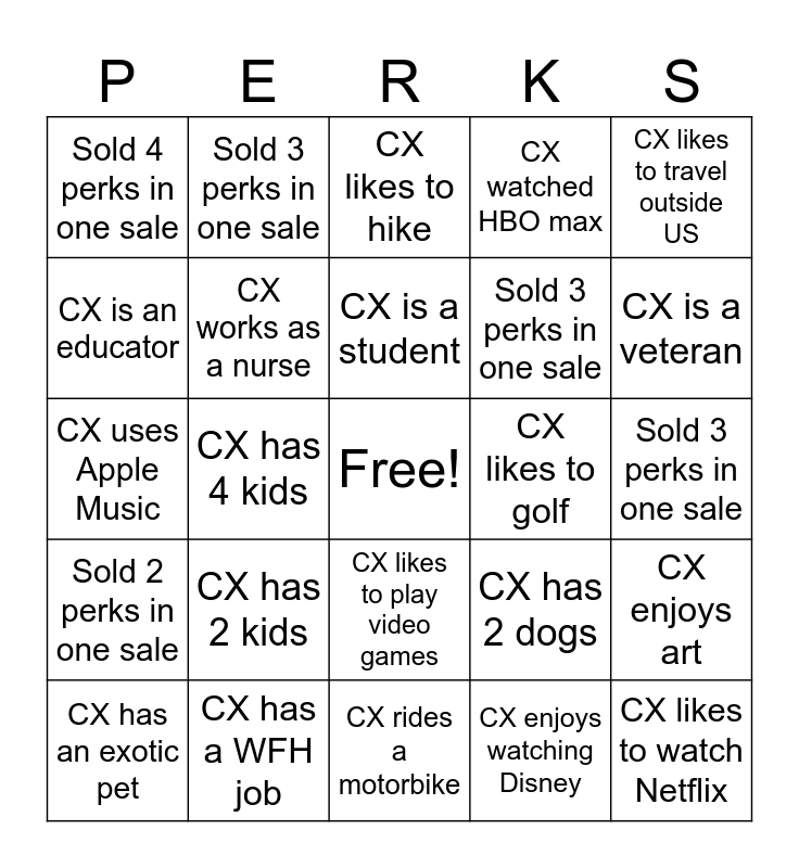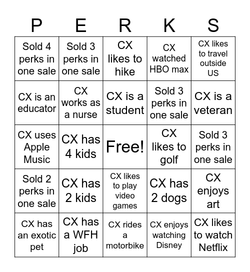 This bingo card has a free space and 29 words: CX has an exotic pet, CX works in construction, CX has 4 kids, CX owns a business, Sold 4 perks in one sale, CX likes to hike, CX works as a nurse, CX has 2 kids, CX likes to golf, CX has a WFH job, Sold 3 perks in one sale, CX likes to watch Netflix, CX rides a motorbike, CX enjoys watching Disney, CX is a veteran, Sold 4 perks in one sale, CX likes to play video games, Sold 2 perks in one sale, CX likes to travel outside US, CX uses Apple Music, CX has 2 dogs, CX enjoys photography, Sold 3 perks in one sale, CX is an educator, CX watched HBO max, Sold 3 perks in one sale, CX enjoys art, CX is a student and Sold 2 perks in one sale.