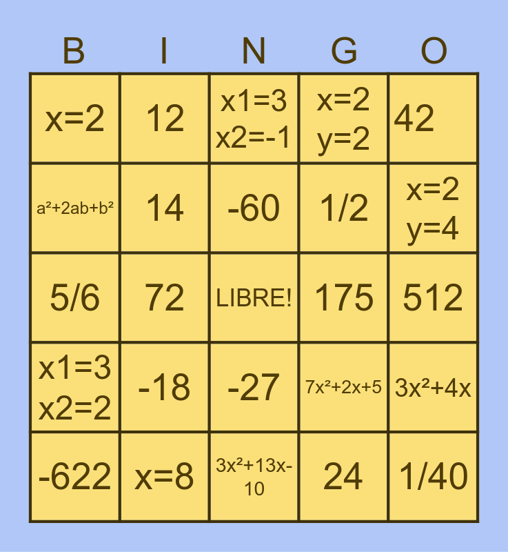 This bingo card has a free space and 24 words: -622, -18, -60, 24, 42, x=2, 12, x1=3 x2=-1, 175, 512, 5/6, 14, 7x²+2x+5, 3x²+4x, a²+2ab+b², x=8, 3x²+13x-10, x=2 y=2, x=2 y=4, x1=3 x2=2, 72, -27, 1/2 and 1/40.