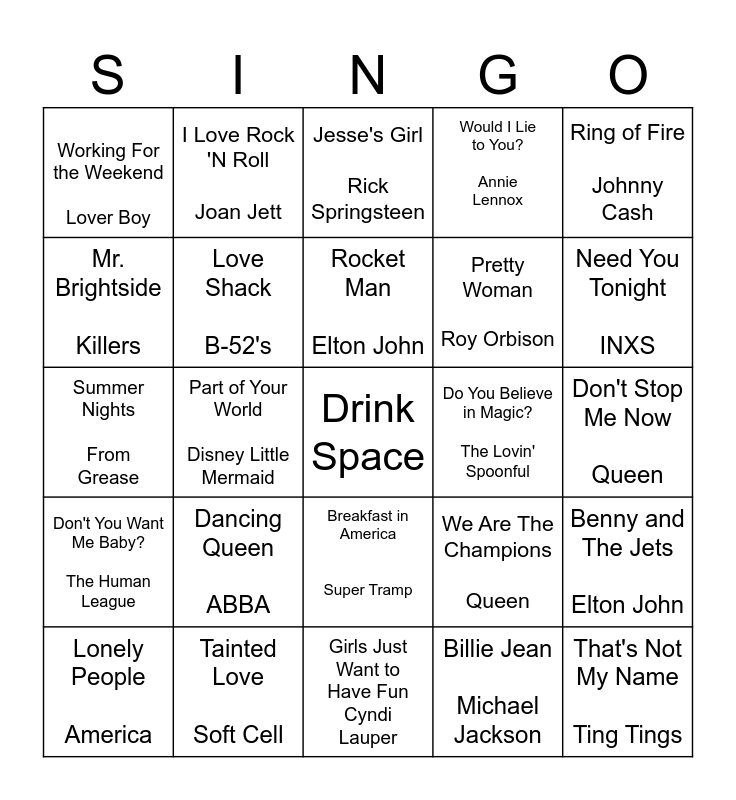 This bingo card has a free space and 79 words: She Drives Me Crazy Fine Young Cannibals, Carry On Wayward Son Kansas, Jesse's Girl Rick Springsteen, Bohemian Rhapsody Queen, I'm a Believer The Monkees, Maneater Hall & Oates, You Shook Me All Night Long AC DC, Baby Love The Supremes, Hakuna Matata Disney's Lion King, Don't Stop Believing Journey, 9 To 5 Dolly Parton, Juke Box Hero Foreigner, Would I Lie to You? Annie Lennox, Working For the Weekend Lover Boy, Is This Love? Bob Marley, Mr. Brightside Killers, Better Place NSYNC, Dancing Queen ABBA, Take It Easy The Eagles, Don't Stop Me Now Queen, Dancing In the Dark Bruce Springteen, Ring of Fire Johnny Cash, Summer Nights From Grease, Rocket Man Elton John, Love Shack B-52's, Can't Help Falling in Love Elvis, I will Survive Gloria Gaynor, Can't Take My Eyes Off You Fankie Valli, Country Roads John Denver, Don't You Forget About Me Simple Minds, Need You Tonight INXS, Man! I Feel Like a Woman! Shania Twain, Girls Just Want to Have Fun Cyndi Lauper, Call Me Maybe Carly Rae Jensen, Lonely People America, Do You Believe in Magic? The Lovin' Spoonful, Closing Time Semi Sonic, All Star SmashMouth, Band On The Run Paul McCartney, That's Not My Name Ting Tings, Build Me Up Buttercup The Foundations, Brown Eyed Girl Van Morrison, Hotel California The Eagles, Sweet Home Alabama Lynyrd Skynyrd, Kokomo The Beach Boys, I Love Rock 'N Roll Joan Jett, Baby I love your way Peter Frampton, Hollaback Girl Gwen Stefani, Never Gonna Give You Up Rick Astley, Uptown Girl Billy Joel, Benny and The Jets Elton John, Part of Your World Disney Little Mermaid, We Are The Champions Queen, I Want To Hold Your Hand The Beatles, You're So Vain Carly Simon, Roxanne The Police, American Girl Tom Petty, Free Fallin' Tom Petty, Danger Zone Kenny Loggins, Breakfast in America Super Tramp, Pretty Woman Roy Orbison, Rock N Roll All Night Kiss, Love Story (Romeo and Juliet) Taylor Swift, Dancin' In the Moonlight King Harvest, Mr. Blue Sky E. L. O., Message in a Bottle The Police, 867-5309 Jenny Tommy Tutone, It's Still Rock and Roll To Me Billy Joel, Your Love (Josie's on a vacation) The Outfield, Don't You Want Me Baby? The Human League, Tainted Love Soft Cell, I Can't Go For That Hall & Oates, The Gambler Kenny Rogers, Hey Mickey Toni Basil, Like a Virgin Madonna, Billie Jean Michael Jackson, One Way or Another Blondie, Rockin' Me Steve Miller and I Want You Back Jackson 5.